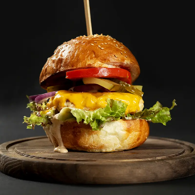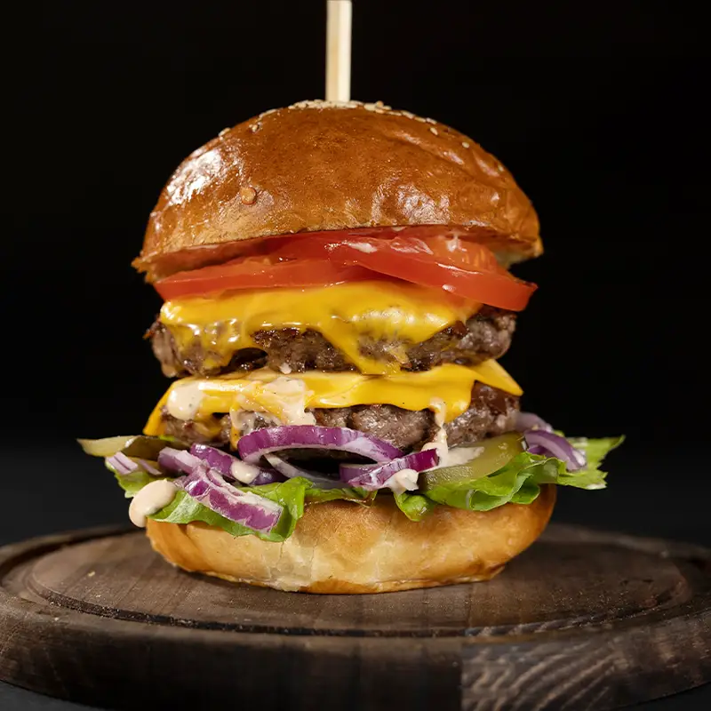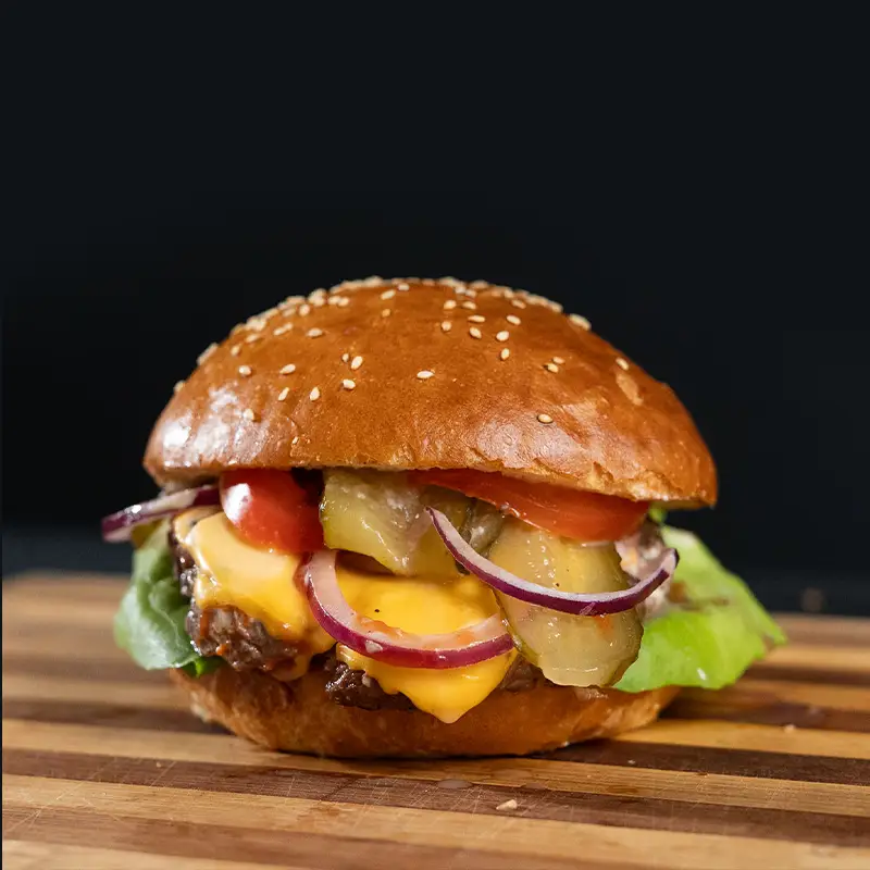 Branza Cheddar 40 G, Castraveti murati 30 G, Ceapa rosie 15 G, Chifla hamburger 1 Buc, Hamburger 2 Buc, Ketchup 30 G, Piper negru macinat 2 G, Rosii 40 G, Salata verde 10 G, Sos 1000 insule 30 G, Ulei 2 G