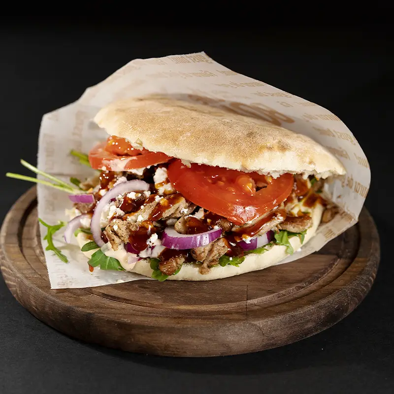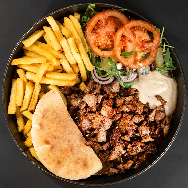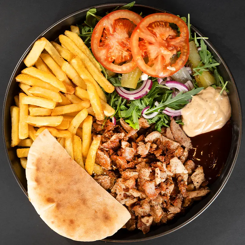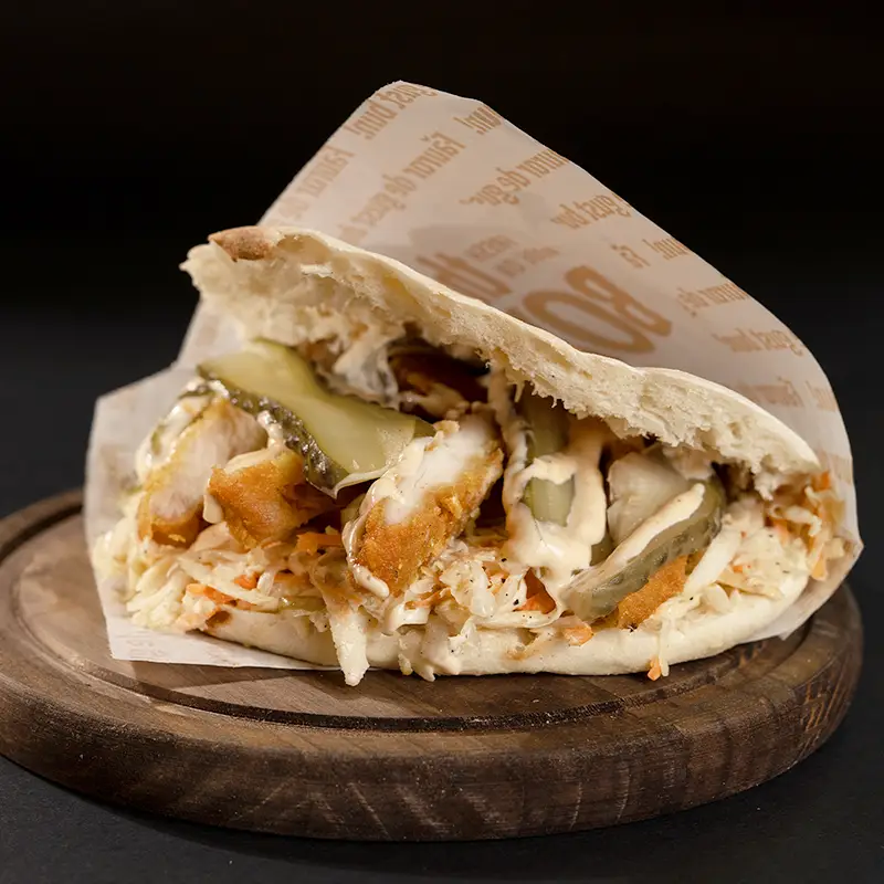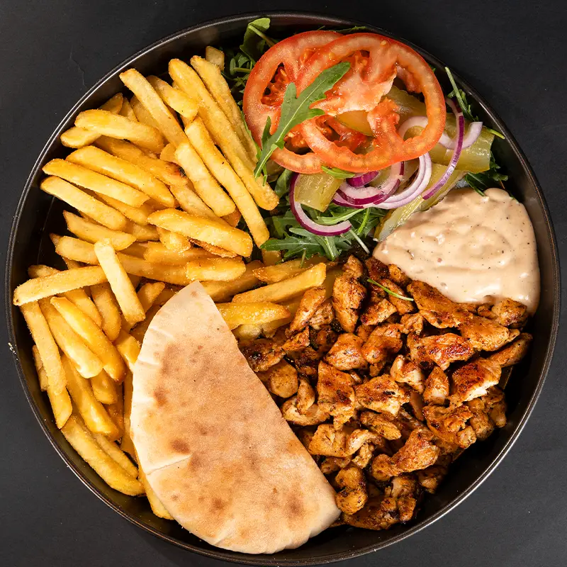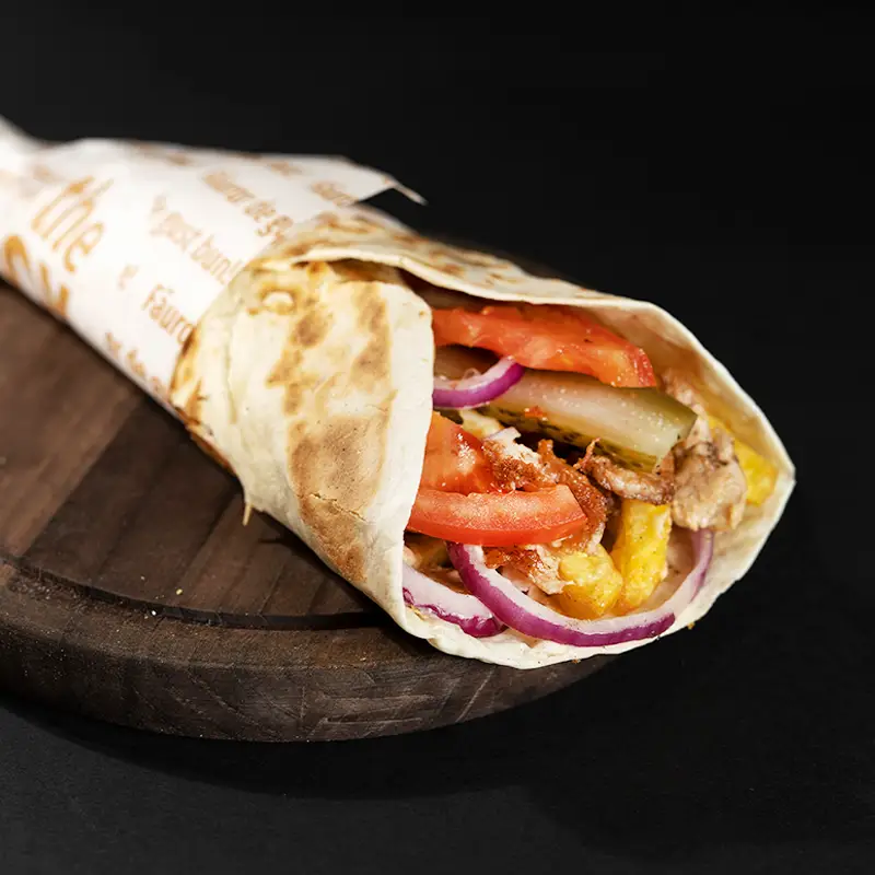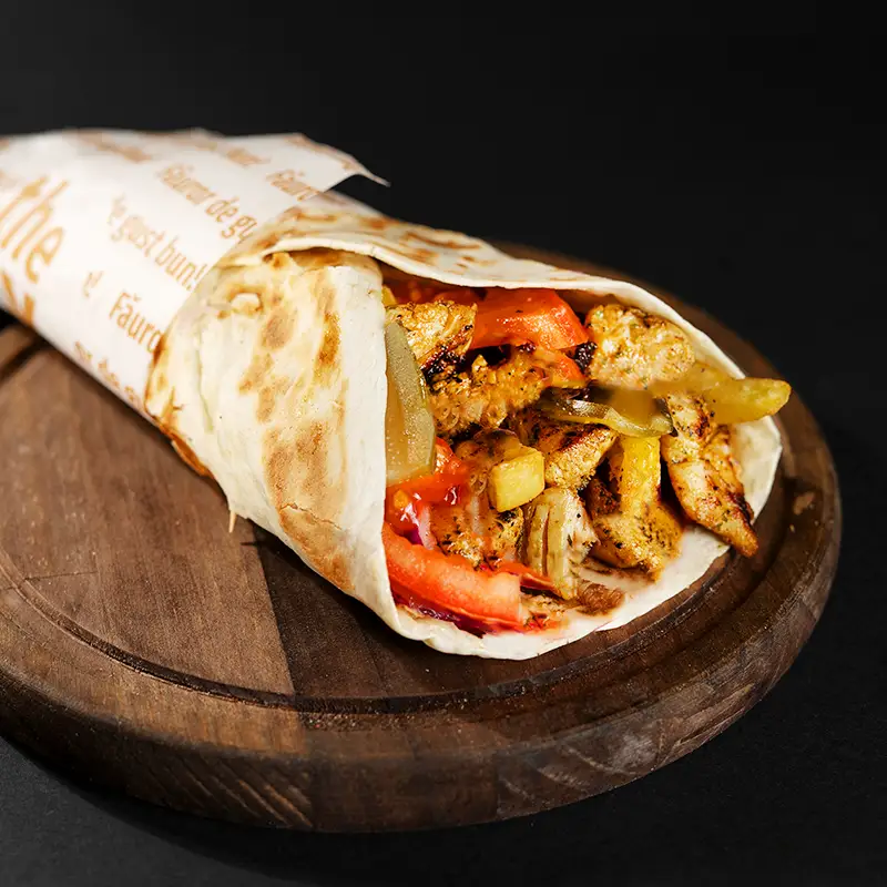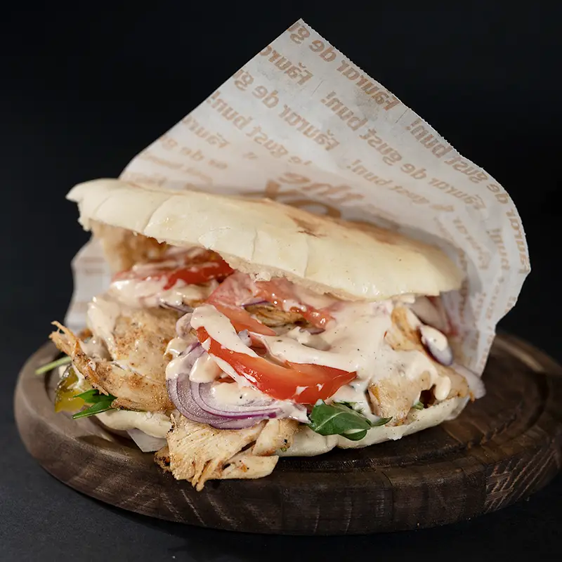 Carne cruda pui 200g, Piper negru macinat 2g, Sare 2g, Cartofi prajiti 100g, Usturoi granulat 2g, Rosii 50g, Castraveti murati 30g, Lipie 1 Buc 70g, Salata verde/ Rucola 20g, Sos usturoi/ sos 1000 insule 60g, Ulei 10