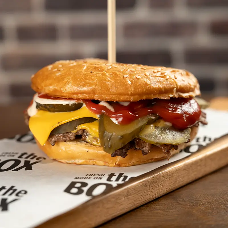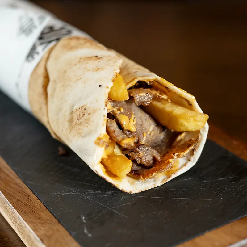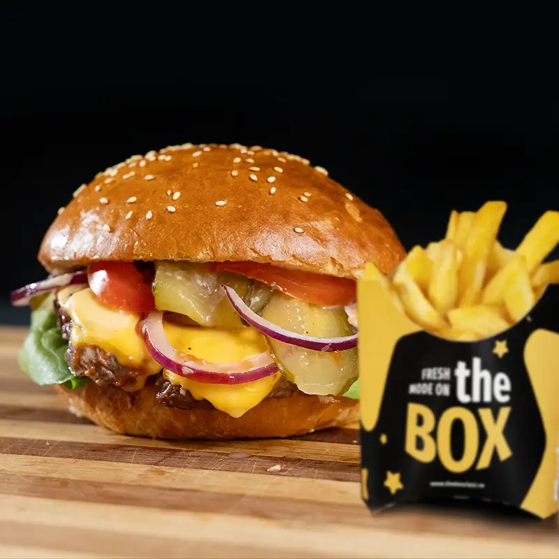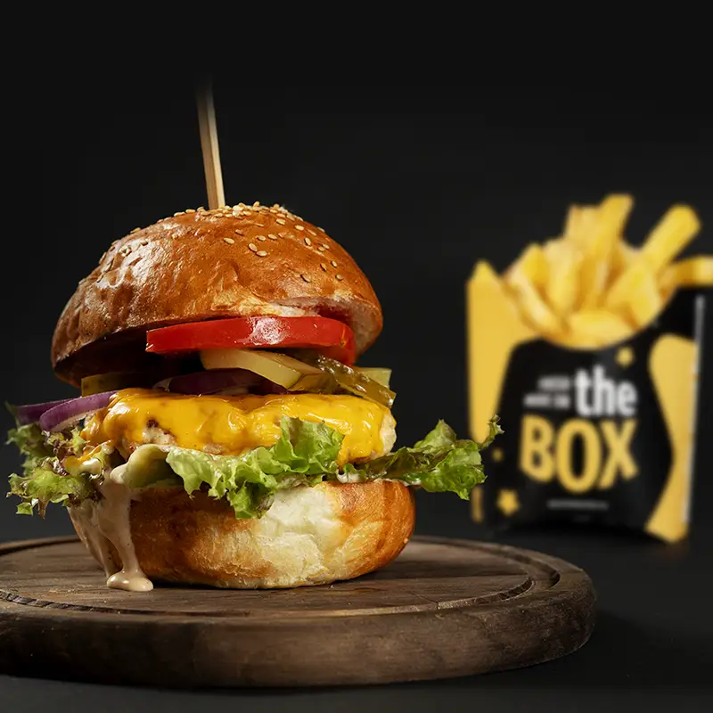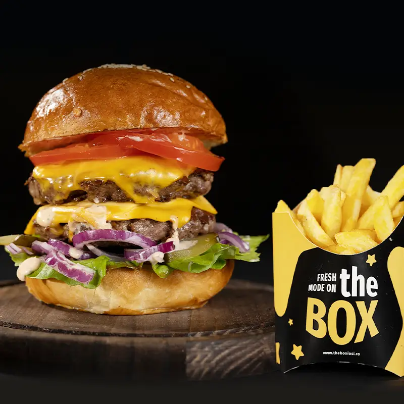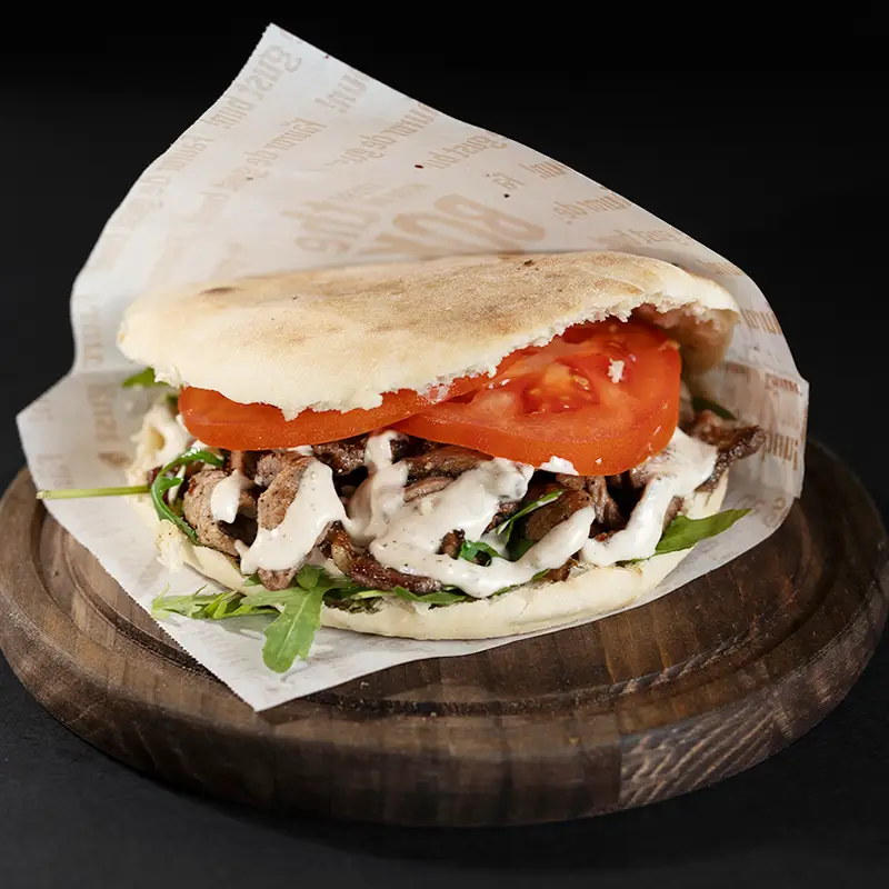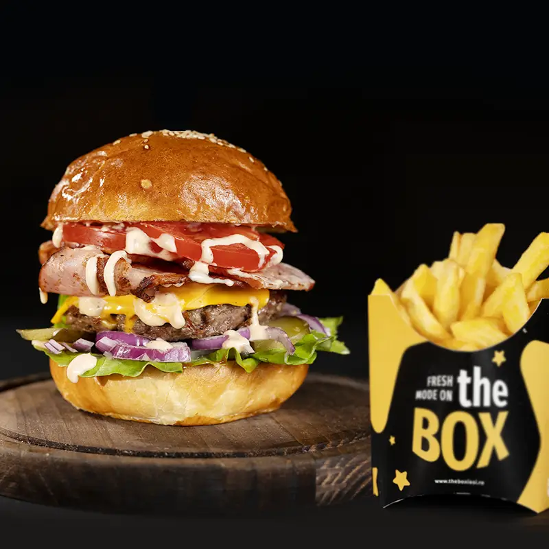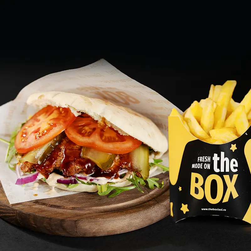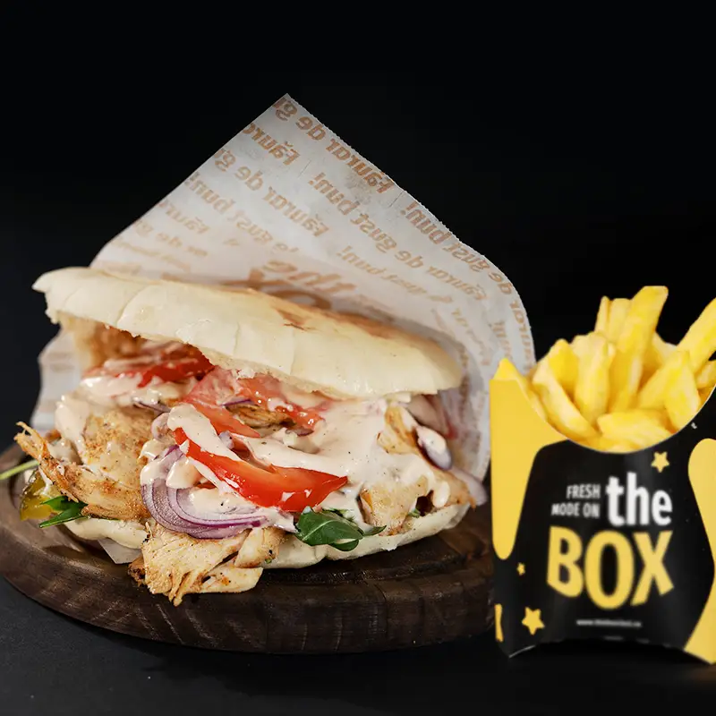 Carne de vita 150 G, Lipie 1 buc 70 G, Cartofi prajiti 70 G, Rosii 50 G, Castraveti murati 50 G, Ceapa rosie 30 G, Sare 2 G, Piper negru macinat 2 G, Usturoi granulat 2 G, Ulei 10 G, Sos The BOX 30 G, Rucola/Salata verde 20 G