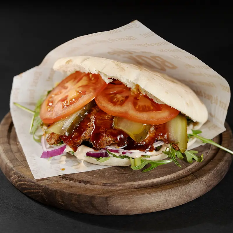 Pulpa porc sous-vide 200g, Cartofi prajiti 100g, Usturoi granulat 20g, Rosii 50g, Ceapa rosie 30g, Sos 1000 insule 60g, Lipie 1 Buc 70g, Salata 20g, Castraveti murati 30g, Sos Barbeque 30g, Ulei 10g, Sare 2g, Piper negru macinat 2g