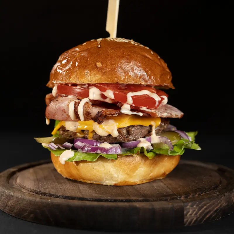 Bacon 50 G, Branza Cheddar 20 G, Castraveti murati 30 G, Ceapa rosie 15 G, Chifla hamburger 1 Buc, Hamburger 1 Buc, Ketchup 30 G, Piper negru macinat 2 G, Rosii 40 G, Salata verde 20 G, Sare 2 G, Sos 1000 insule 30 G, Ulei 20 G