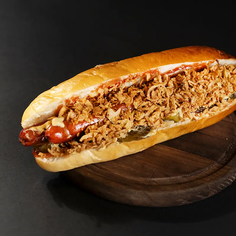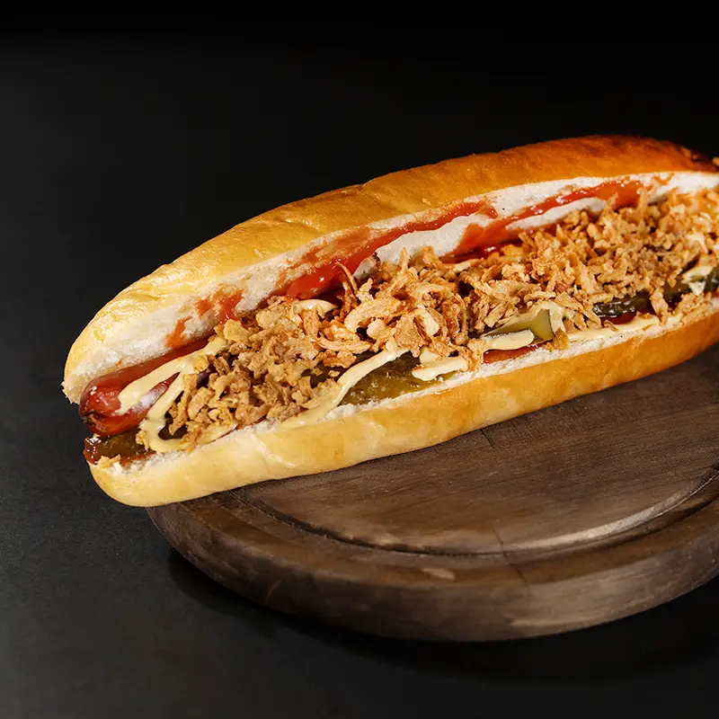 Cabanos 80 G, Bagheta 1 Buc, Ketchup 30 G, Castraveti murati 50 G, Ceapa caramelizata 20 G, Ulei 10 G, Sos 1000 insule 60 G