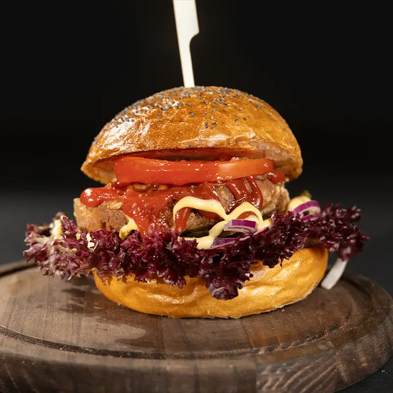 Burger de mazare 1 Buc, Chifla burger post 1 Buc, Ketchup 60 G, Rosii 80 G, Castraveti murati 50 G, Ceapa rosie 10 G, Salata verde 10 G