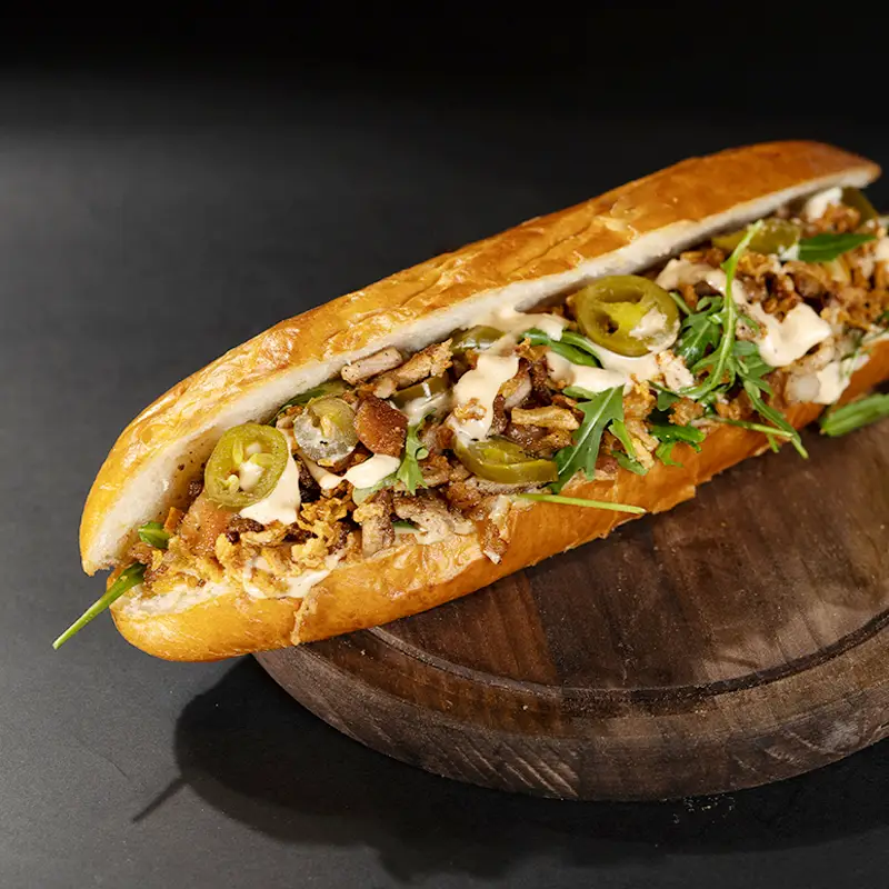 Pulpa porc sous-vide 120 G, Bagheta 1 Buc, Ceapa caramelizata 30 G, Rucola 30 G, Jalapeno 20 G, Sos 1000 insule 60 G, Piper 2 G, Sare 2 G, Ulei 10 G