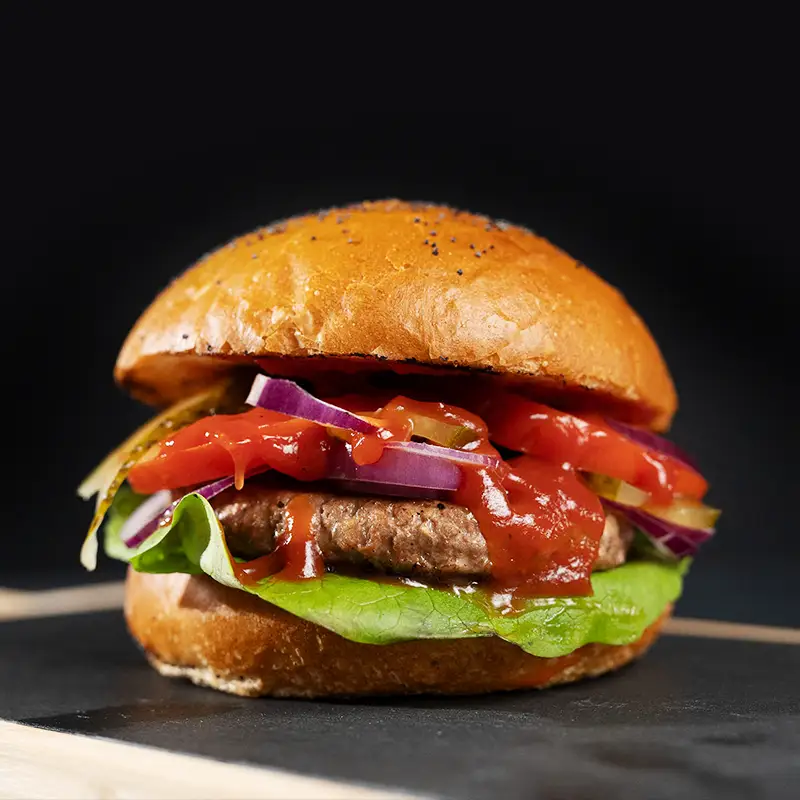 Burger vita 2 buc 150g, Chiflă 1 buc, Ketchup 30g, branza Cheddar 20g, Ceapă roșie 15g, Castraveți murați 30g, Sare 2g, Piper negru macinat 2g, Sos 1000 insule 30g, ulei 20g