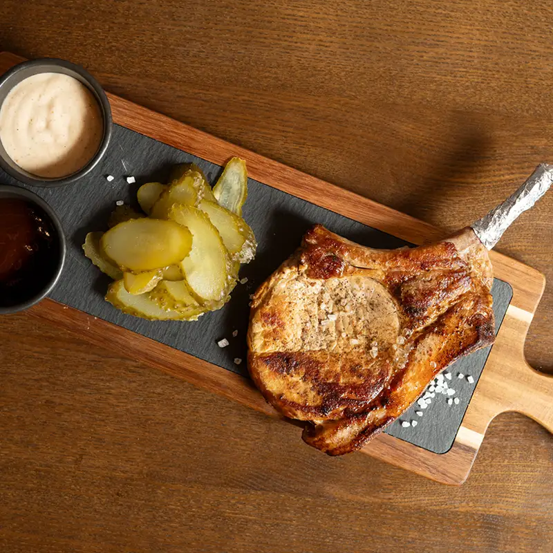 300g cotlet porc maturat, salata castraveti murati 100g, sos bbq 30 g, sos 1000 insule 30g