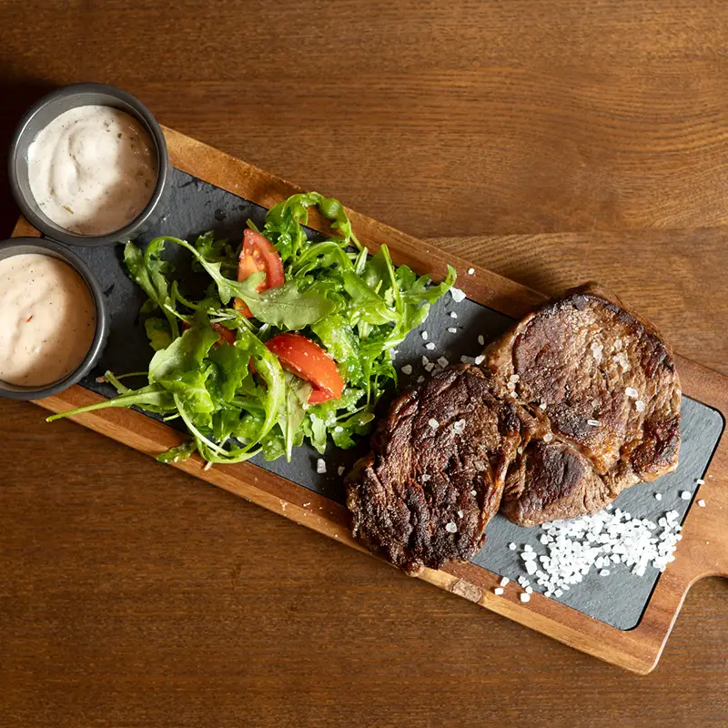 300g antricot maturat vită, rucola 50g, rosii 50g, sos The BOX 30g, sos 1000 insule 30g